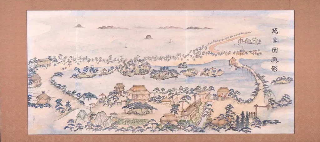 で、画像に写っている場所はどこなの、という話ですが、ほぼ同時期に描かれた万象園の絵図面『萬象園眞影』(画像は模写版)や、遠くに見える下真島の位置から判断すると、現在の『うちわの里』(改修工事中)や『陶器館』がある辺りのように思われます。