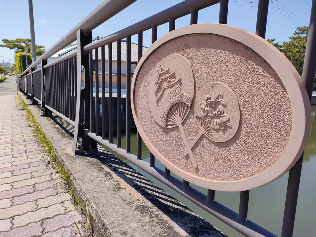 丸亀市の花ですので、中津万象園横に架かる中津大橋にも、うちわに丸亀城とサツキをあしらった意匠が施されています。