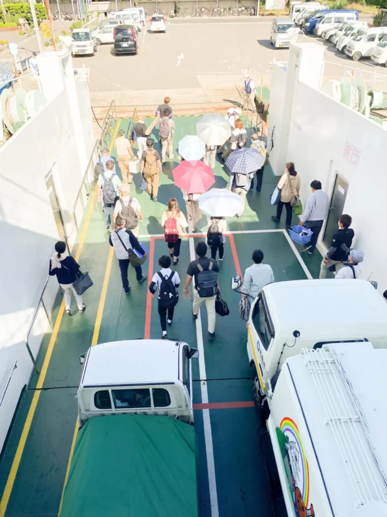 7時40分発のフェリーのゲートがひらくと、出勤などで本島へ乗船する人たちが慣れた様子で乗り始めました。