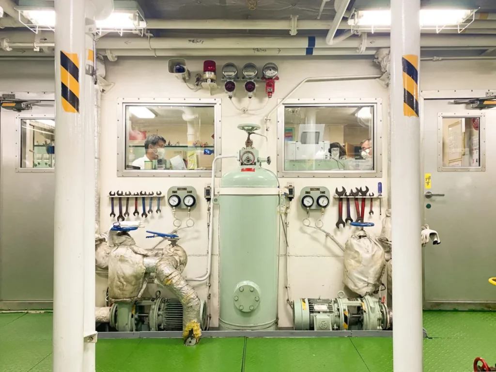 車が乗る緑色の甲板の下にある船の動力・発電をするエンジンと、そのエンジンを管理する管制室。