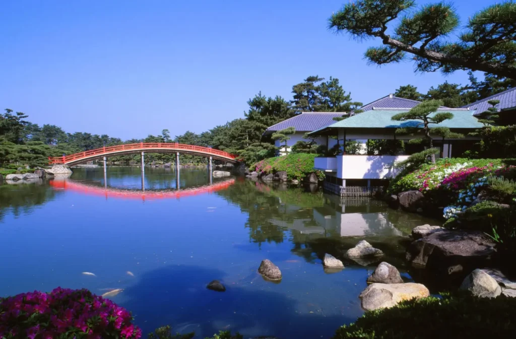 水鳥や鯉が泳ぐ池と8つの島々を中心に、周辺には美しく手入れされた松林が広がり、四季折々の花が咲く木々の間には鳥居回廊や太鼓橋、飛び石、茅葺き屋根のお茶室などが点在する。