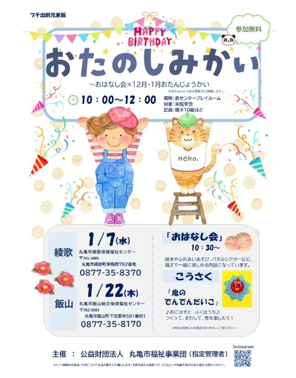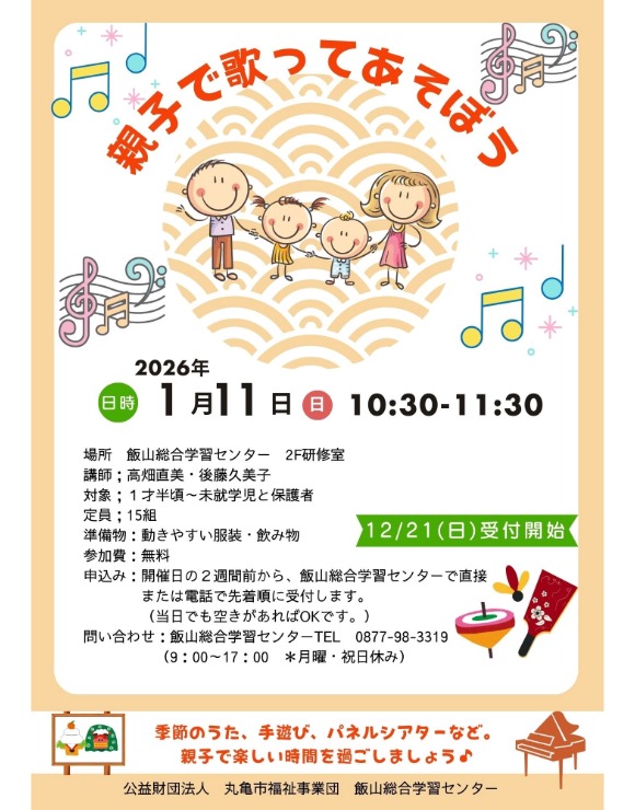 日程 1/11(日)10:30~11:30 場所 飯山総合学習センター 2F研修室(丸亀市飯山町西坂元547-1) 料金 参加無料 対象 1歳半頃~未就学児と保護者 定員 15組(要申込) 問い合わせ 飯山総合学習センター