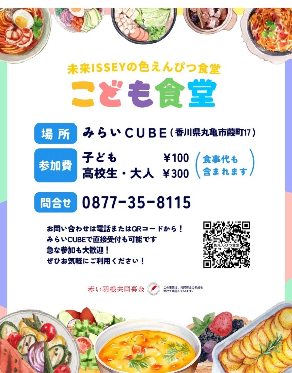 申込/右記URLから申込 https://x.gd/lbNlj 場所 みらいCUBE(丸亀市葭町17) 料金 参加費子ども100円、 高校生・大人300円(食事代込み) 申込 右記URLから申込 https://x.gd/lbNlj 問い合わせ NPO法人未来ISSEY