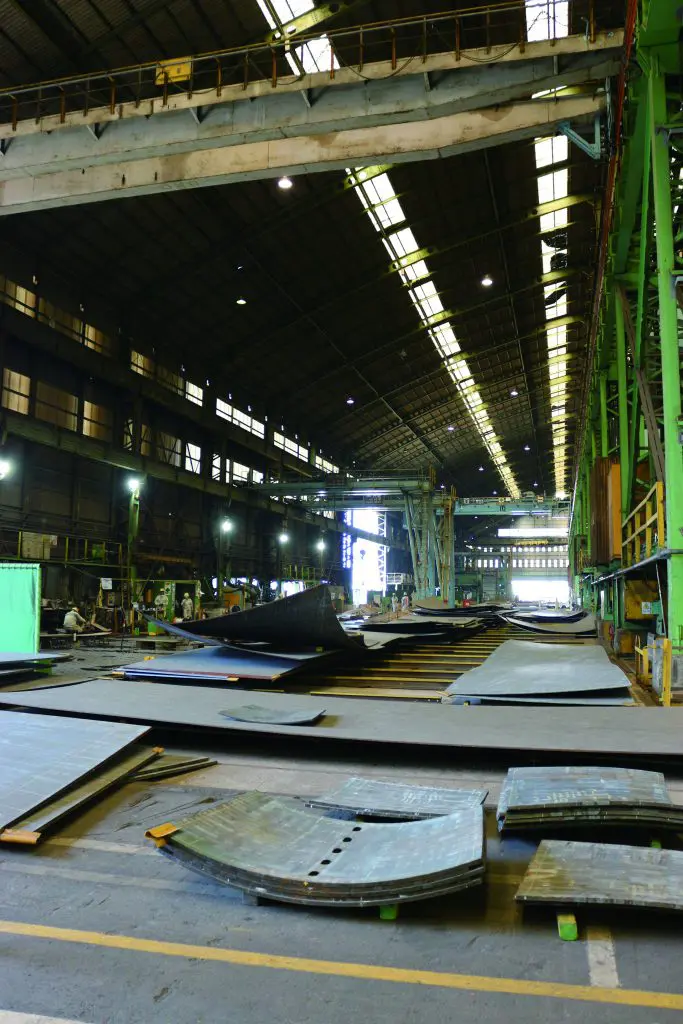 今日、この工場で生み出されている超大型のコンテナ船は、これから地球上のあらゆる海を縦横に行き来します。