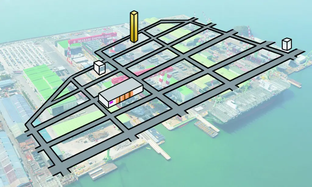 3基のクレーンがそびえる工場は、昭和町にある「今治造船丸亀事業本部」です。
