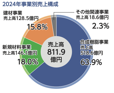 そして今日、「合成樹脂事業」「新規材料事業」「建材事業」「その他関連事業」を中心に、グループ連結売上約811億円、従業員約1900人に成長。