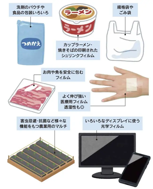 マルータ本誌記事で、日用品や食品の包装フィルムや、よく伸び強い医療用フィルム、ディスプレイに使う光学フィルムなど、いろんな製品を紹介しました。